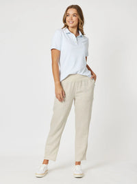 The Jersey Waist Linen Pant by Gordon Smith is one our best sellers! Loved for its relaxed casual styling and fit this pull on pant features a stretch jersey waistband with a firm 4cm elastic band on a quality linen lounge style pant. With handy side pockets and a slightly nipped hem finish this pant is super comfortable and perfect as a wardrobe staple to take you right through the warm months ahead. The perfect travel companion these pants fold to almost nothing and the silicon wash makes ironing easier.