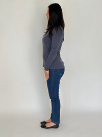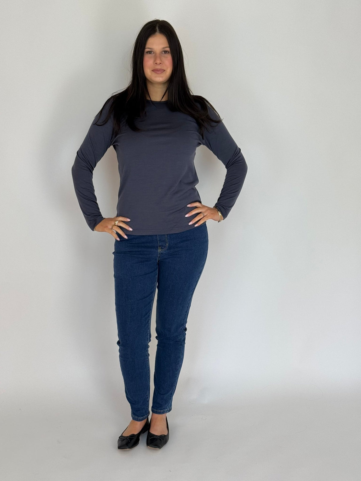 The Satin Trim Round Neck is a fundamental, 100% merino top featuring a crew neck and available in an array of gorgeous colours.