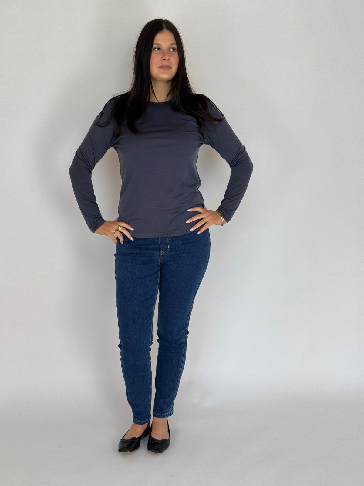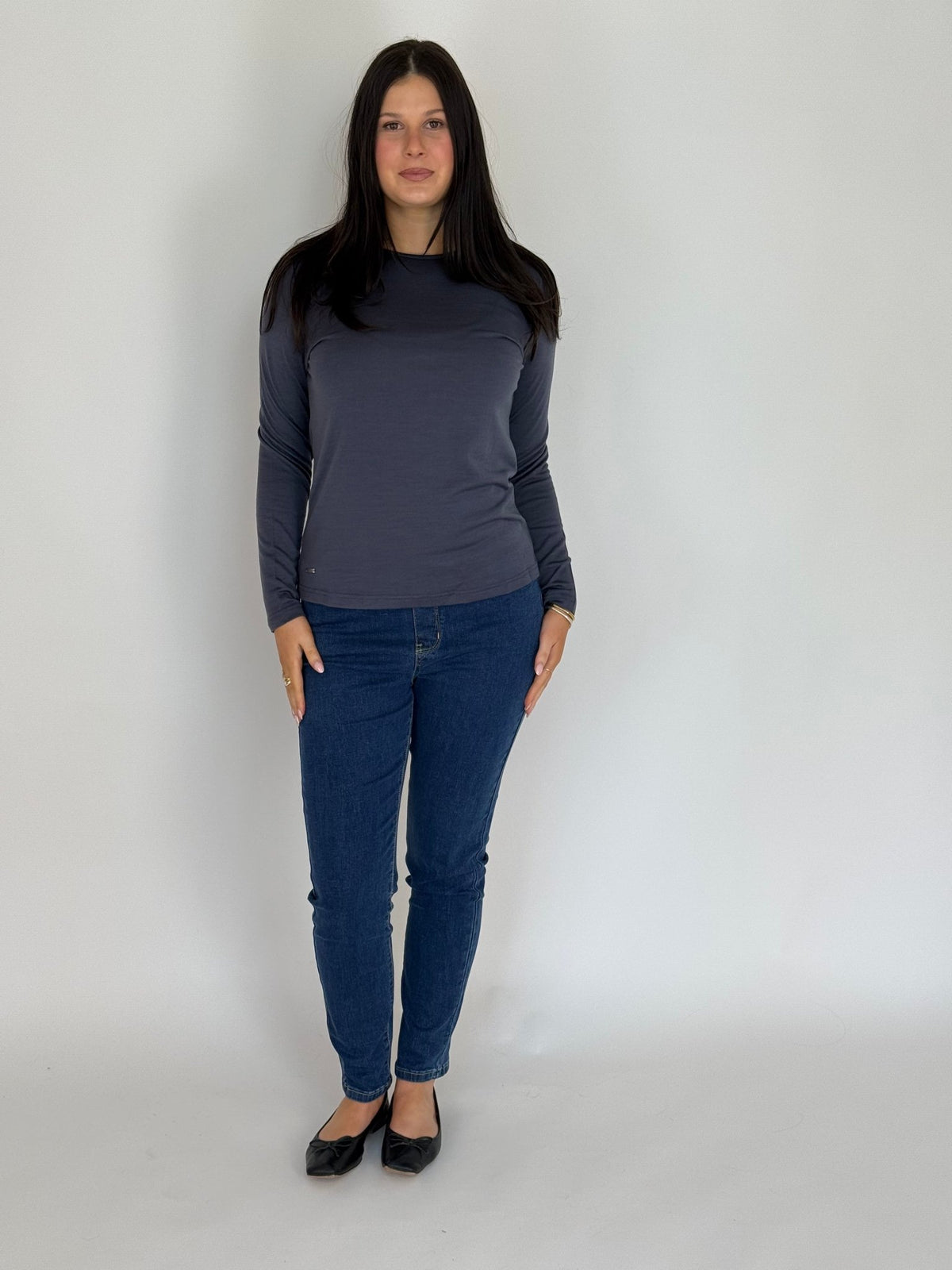 WOMEN'S 100% MERINO WOOL (210) LONG SLEEVE SATIN CREW TOP INDI BLUE EBAS503