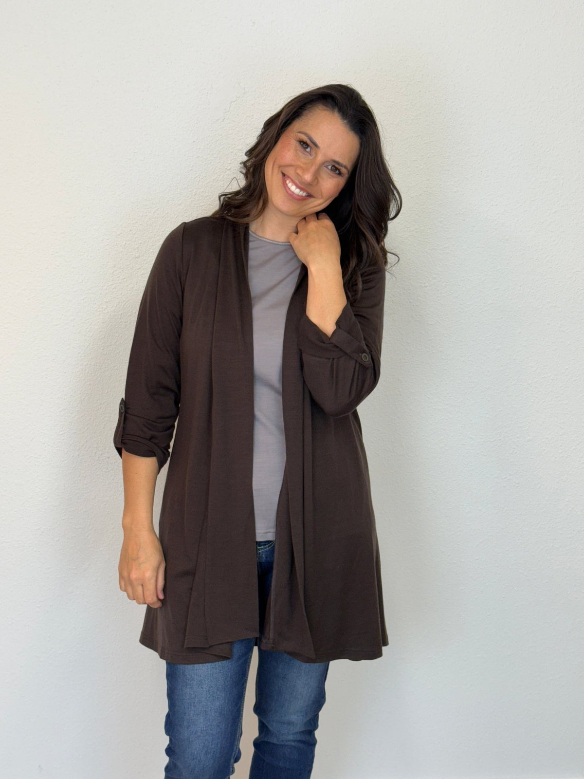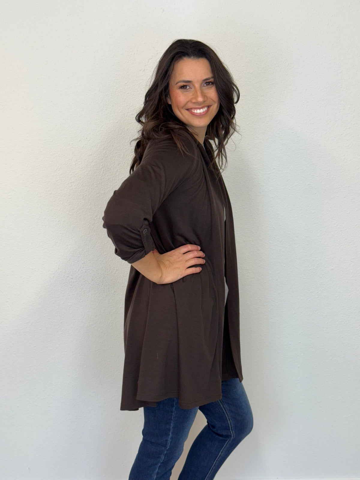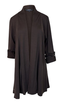 EBONY TAB SLEEVE 100% MERINO EDGE TO EDGE A-LINE CARDIGAN CHOCOLATE EBAS591CHO