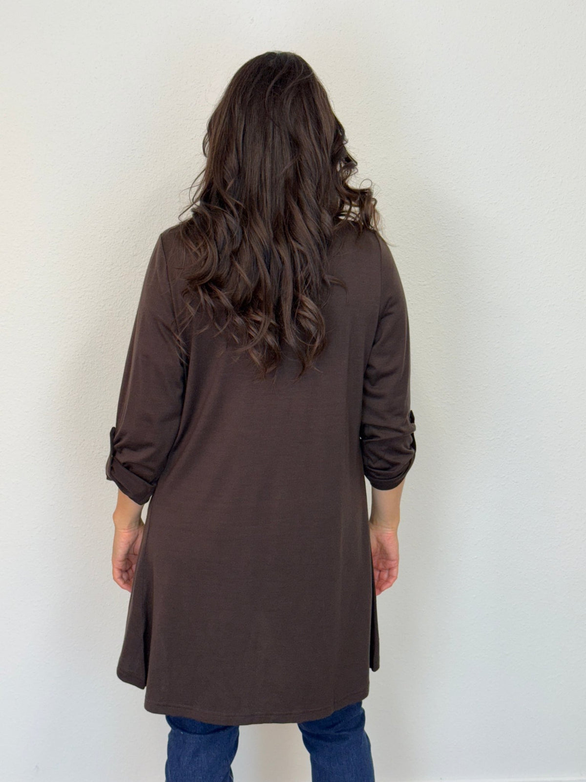 TAB SLEEVE 100% MERINO EDGE TO EDGE A-LINE CARDIGAN CHOCOLATE EBAS591