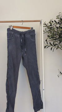 Dress to impress in these exclusive Bottega Moda Washed Denim Joggers. Designed and made in Italy, these jeans have all the glamour you need to elevate any look. You'll love the flattering super stretchy fit, complete with a waist tie and diamante crystal tape down the sides. Plus, with their mid/high waist and regular hem, they're perfect for any occasion (and oh-so comfy too)!