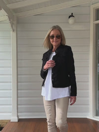 The Threadz Harper Military Denim Jacket is a super versatile jacket suitable all year round.  It features flattering seam detailing, multiple pockets and triangular hemline at the back.