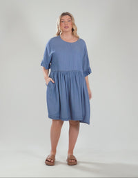 Fabulous and functional, the Charlie Dress in 100% cotton chambray features a flattering Waist gathering and elbow length sleeves with a ruffle at the cuff. This mid length dress is your ultimate comfortable summer dress.