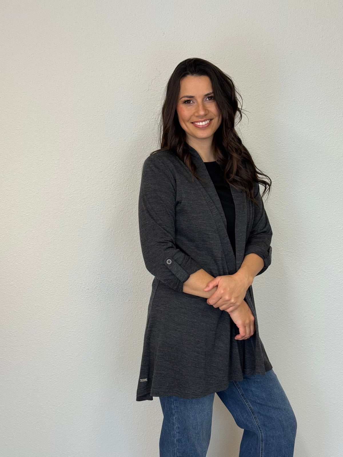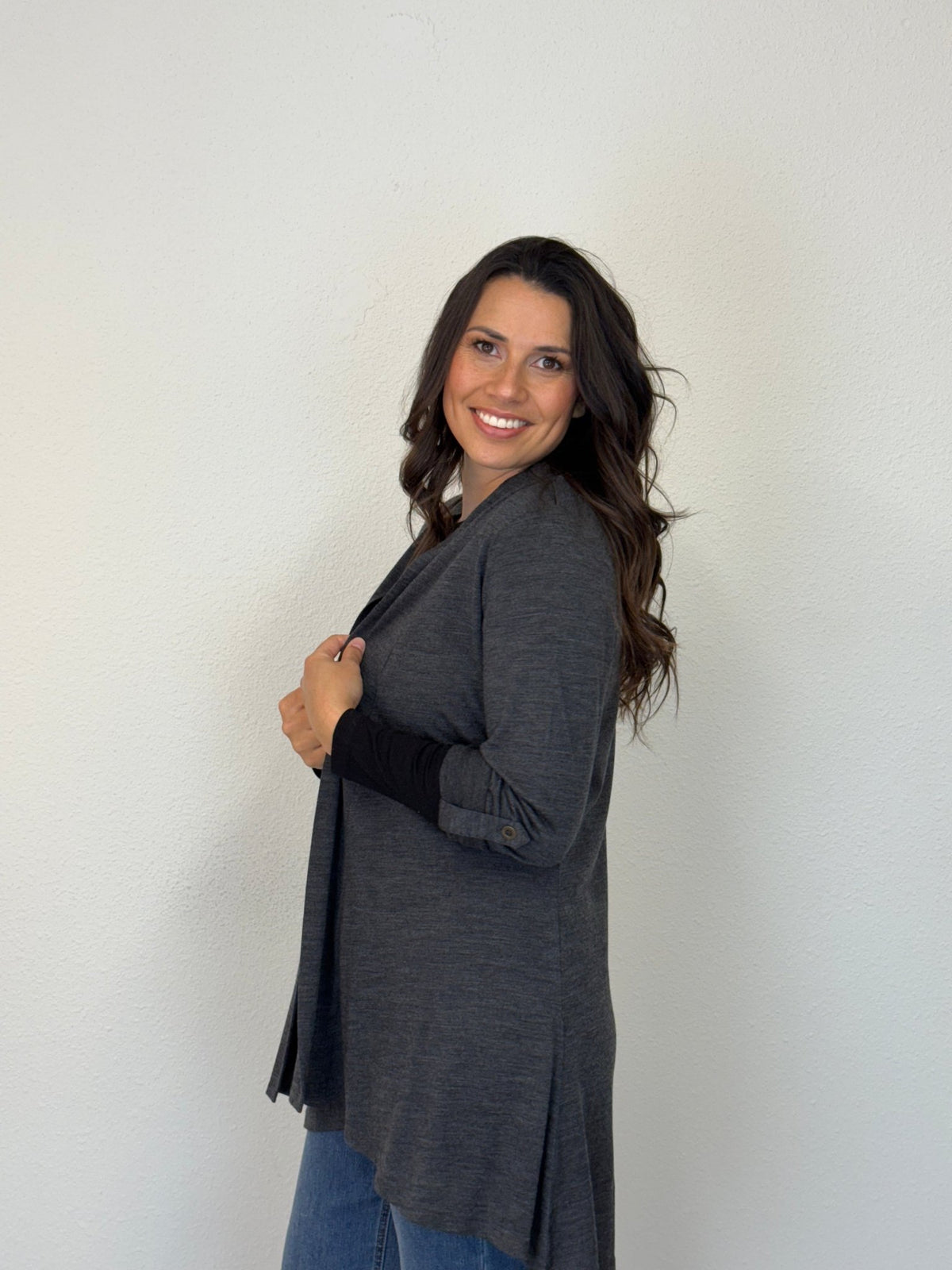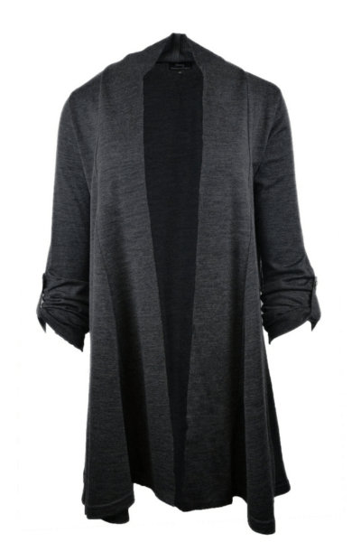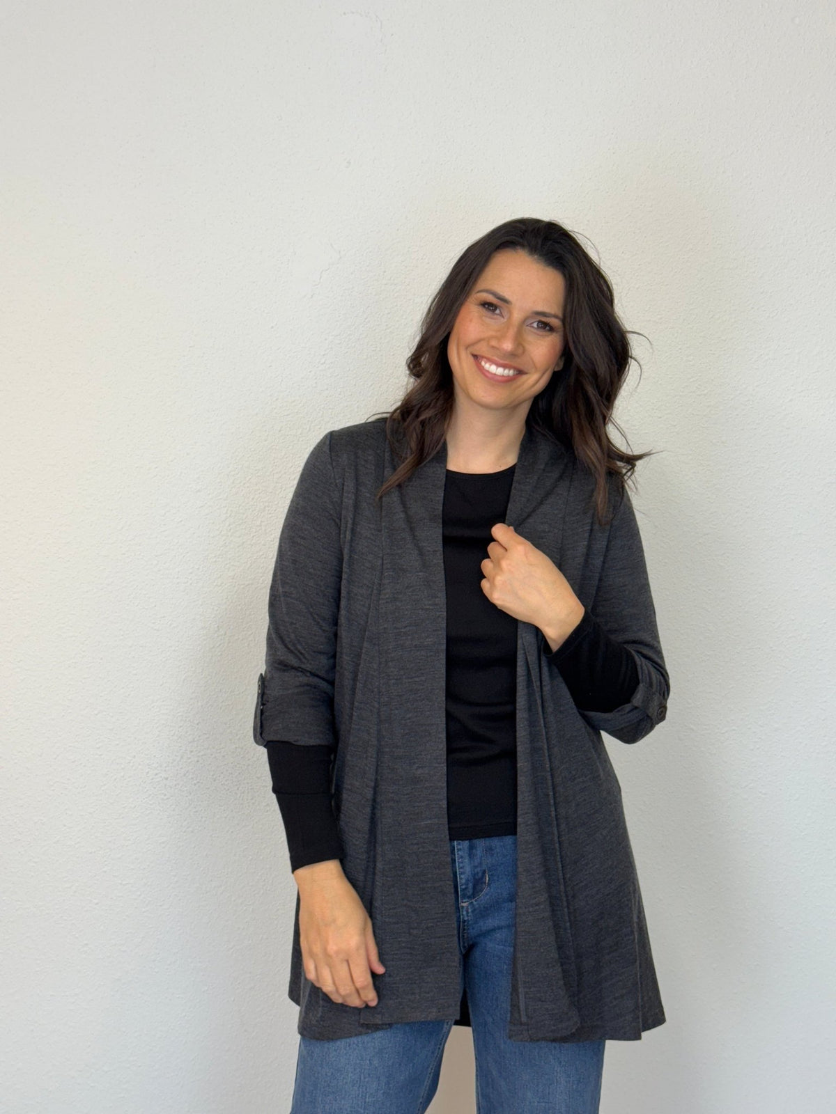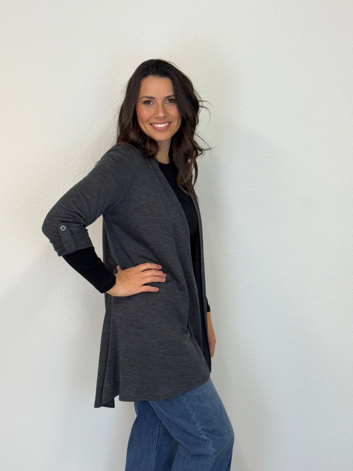 EBONY TAB SLEEVE 100% MERINO EDGE TO EDGE A-LINE CARDIGAN CHARCOAL EBAS591CHA