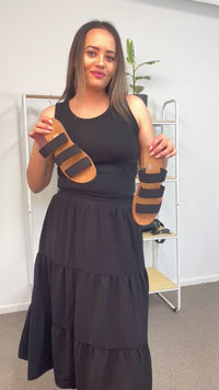 A simple yet stylish tiered skirt which will match back with everything in your wardrobe with ease. Made from a floaty thick weight polyester with just the right amount of drape.