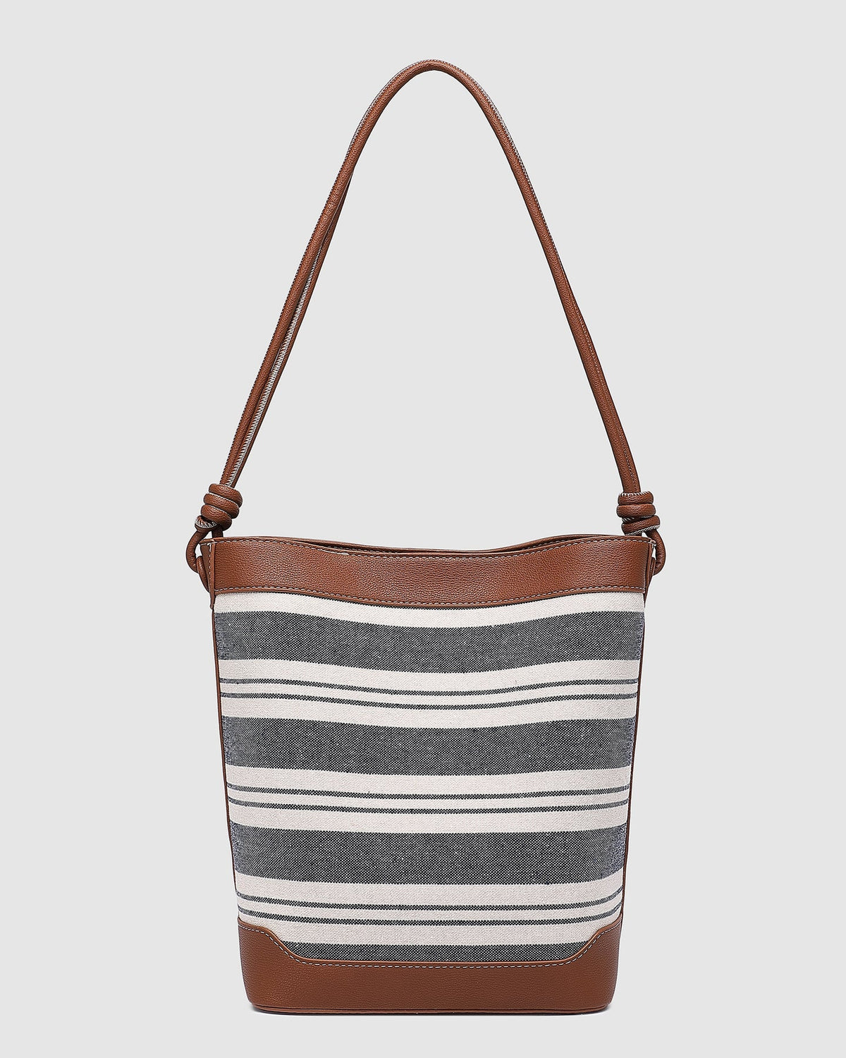 The Louenhide Naples Canvas Navy Stripe Bucket Bag is an effortless style that will take you from day to night on your next summer vacation. This women's bucket bag offers a sleek, modern design that pairs perfectly with your beachwear during the day and effortlessly transitions with your style for those beachside dates at night. The tall tote bag silhouette offers ample space without compromising on style. Pack your sunscreen, hat and favourite book for a day by the waves, then toss in your evening essentials for a seamless transition at night. This women's bucket handbag is easy to carry and perfect for all-day wear. Let the summer fun begin with the Naples Canvas Navy Stripe Bucket Bag by your side.